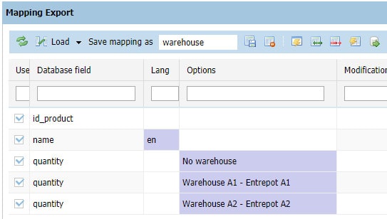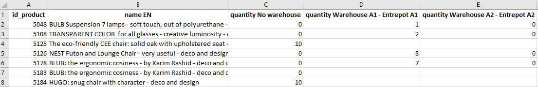 The generated CSV file will then display the products quantity for each warehouse you selected in the mapping