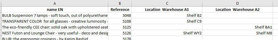 Your CSV file will include a Location column for each warehouse. A product can be in multiple warehouses.
