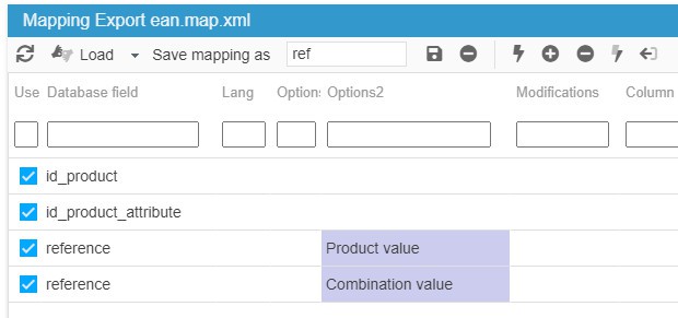 In the mapping panel, the column called 'Options2' includes various options allowing you to decide whether you want to export product or combination information.