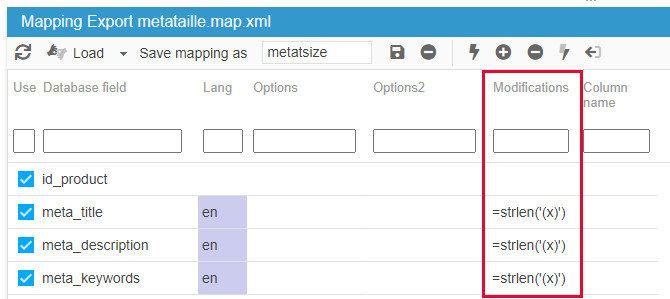If you need to export the current size/length of SEO fields, meta title, meta description and meta keywords, you can use a formula in the 'Modifications' field in the export mapping, as shown on the screenshot below.