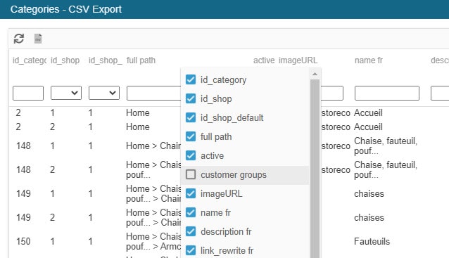 You can customize your export by choosing the columns to take into account, simply by hiding columns you do not want to export: right click on the column titles => untick the fields you do not want.