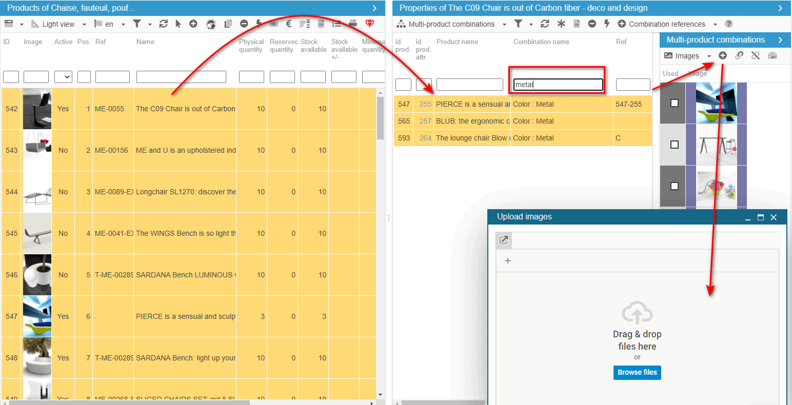 Same as always, you can use the mass-edit options such as: multi-selection, filtering tool, copy/paste, association, sharing, and also adding images to multiple combinations!
