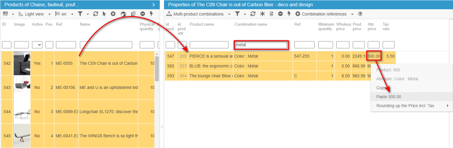 You can also decide to modify the price of a specific attribute. Still filtering the Combination Name column to only display the corresponding combinations, you can then change the price on the first combination, and then copy/paste onto the others.