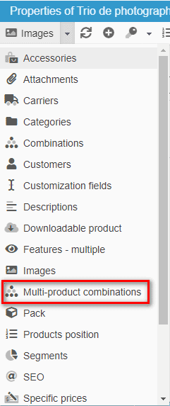 In the Properties column of Store Commander, you will find a panel called 'Multi-product Combinations' where combinations of multiple products previously selected are displayed.