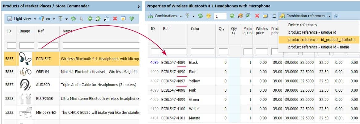 - Product reference - id_product_attribute