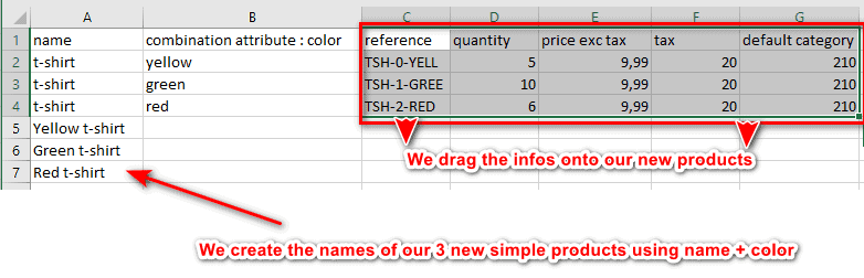 In the column NAME, we create the name of the 3 new products (name + attributes) and drag the other data to the rows of the new names: