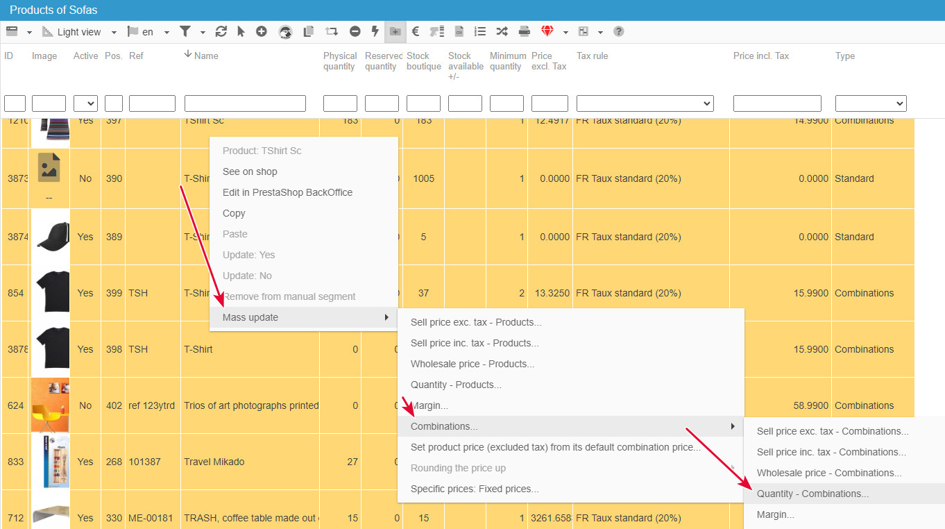 2- Right-click on the concerned products > Mass update > Combination > Quantity - combinations.
