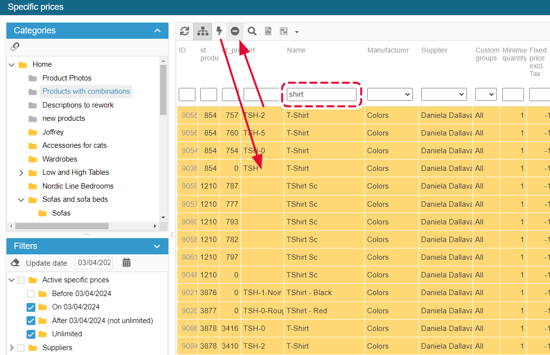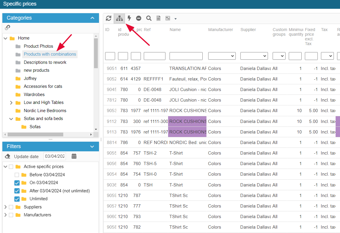 You can then select a category on the left handside and existing specific prices on products will be displayed. To see specific prices on combinations, enable this option on the toolbar: