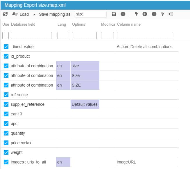 Once the file is exported, you will have 1 line per combination, with 1 column per attribute group: Size, sizes, SIZE.
