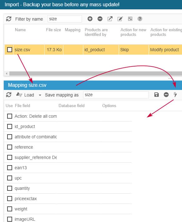 The column titles of your csv file are automatically displayed in the mapping panel. Click on the last icon  for the mapping to be completed automatically.