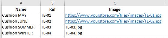In this case, your CSV file will need to include /cushions/image01.jpg.
