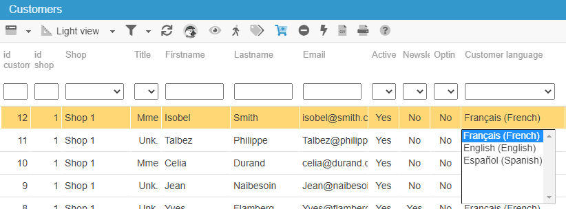 The field 'Customer language' is editable. Simply double click the cell to select the language.