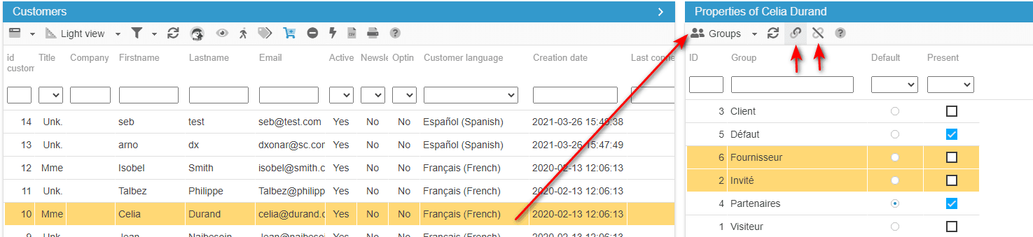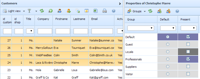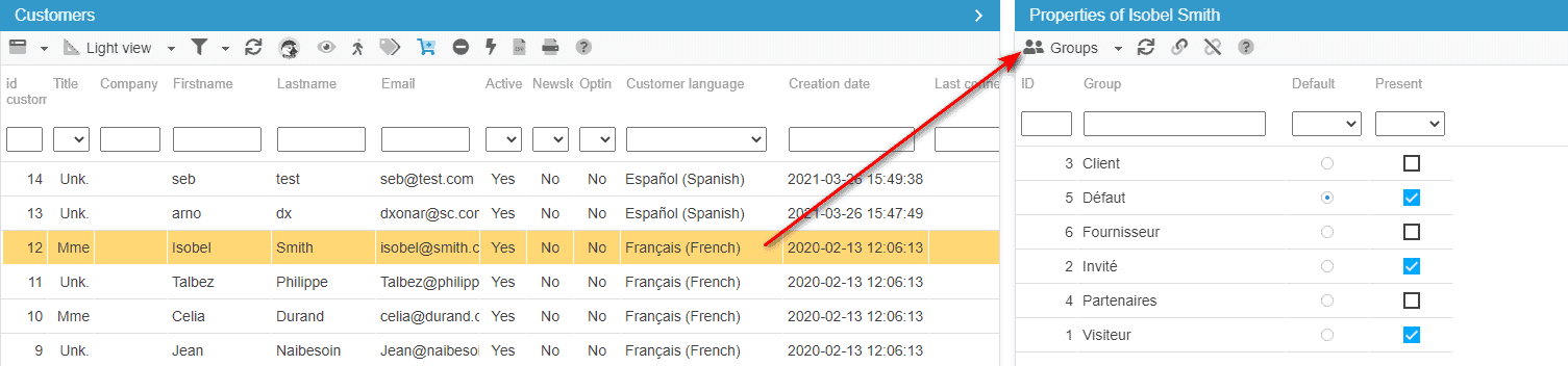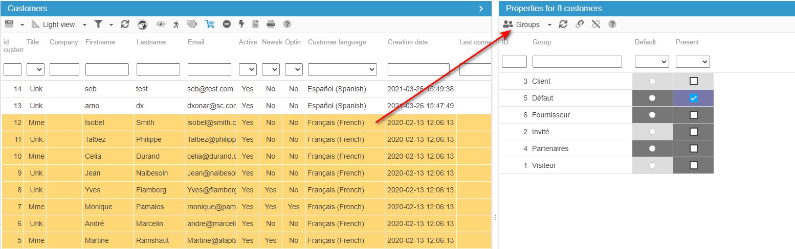 As soon as you select a customer in the central panel (on an orange background), the groups associated are displayed as well as the default group.