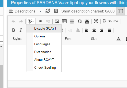 The text editor used in the Sc Description panel includes a spellchecker that you can enable, and also choose the language to be checked when writing your product descriptions.