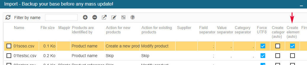 If the names of the new groups are not automatically completed in the Options colunm after clicking on the 'Load fields by name' icon, this means that the column titles of your files are not correct.