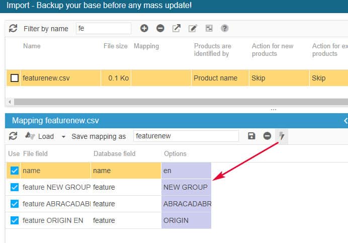 Using the 'Load fields by name' to automatically fill in the feature group name is what's going to create the new group. It's therefore necessary to respect the correct syntax in the column title if you want new feature groups to be created during the import process.