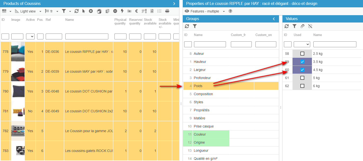 What's more? You can for instance select all the products of a category and associate multiple feature values in just a few clicks: