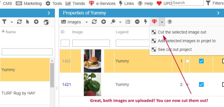 All images are now loaded on your product (1) and you can now use the image cutout tool to improve the background (2)