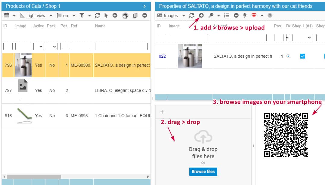 To add the same image(s) to multiple products, same upload procedure once you have selected the products in the central column.