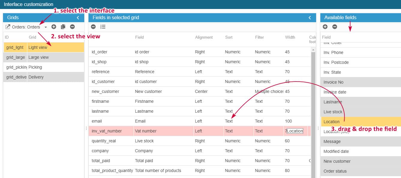 With the classic version of the interface customization tool, you can add existing fields to various views and grids in the interface of Store Commander.
