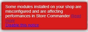 When launching Store Commander, an alert is displayed in a red box at the bottom right of the interface: