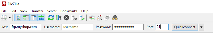 From the connection bar, enter the FTP address of your store, username and password to connect to your site.