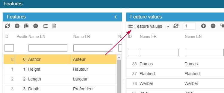 On the left panel, the list of all groups, and on the right panel, the list of all corresponding features (whatever shops they exist in).
