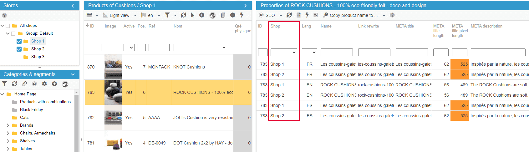Indeed, the panel includes a 'Shop' column that helps you identify the product information on each shop - and any language installed on your store.