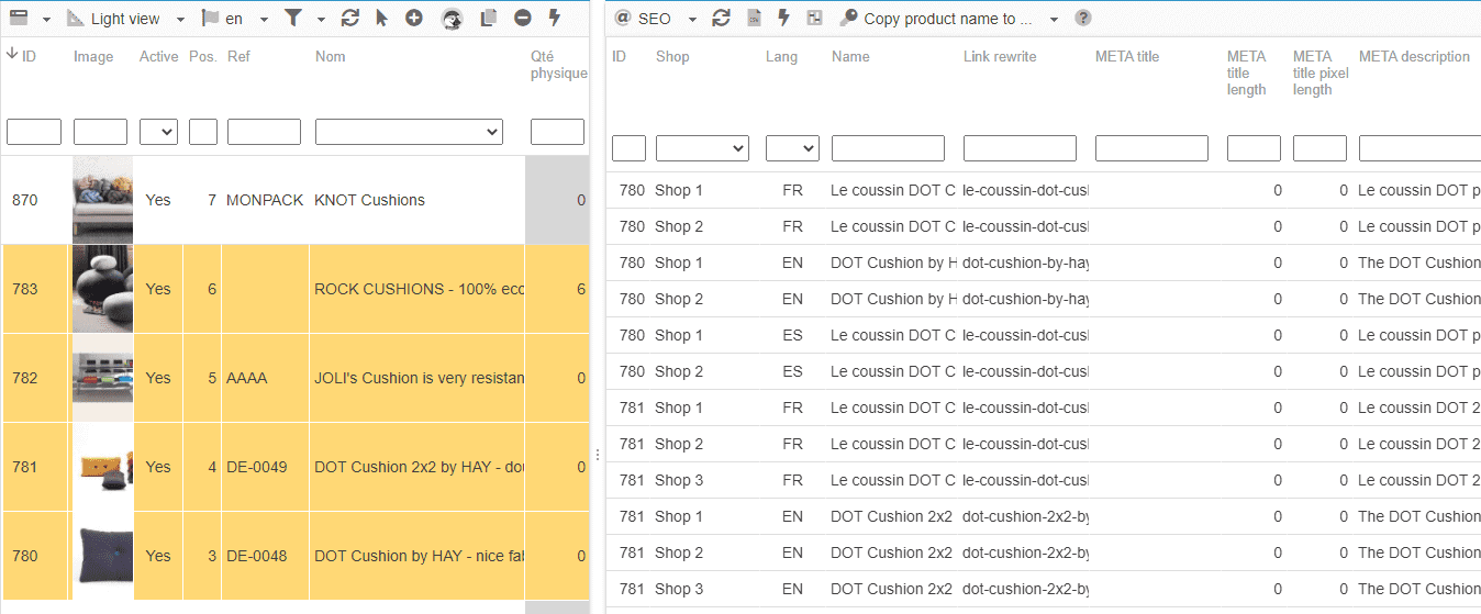 This is where you can visualize and modify the product SEO information on each of your shops.
