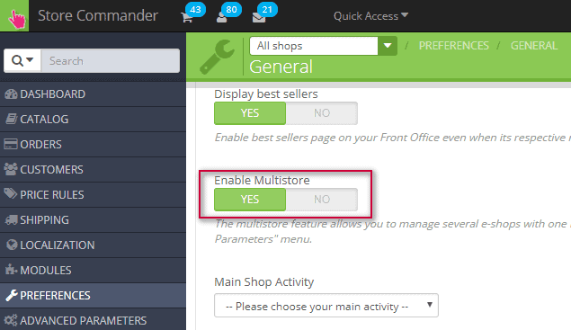 To enable the option, you need to navigate into PrestaShop backoffice > Preferences > General > Enable Multistore