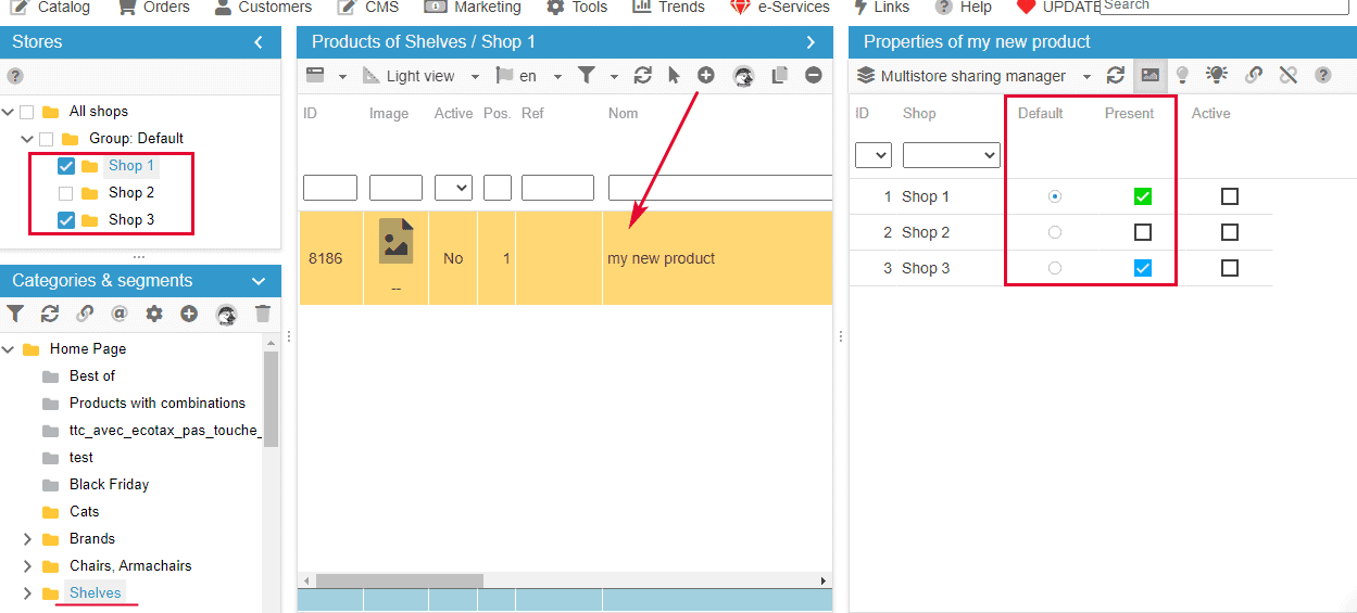 In just one manipulation, your product is created and associated to all shops configured in your store tree, and you can verify in the MultiStore Sharing Manager panel in the Properties column.