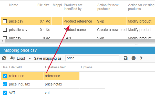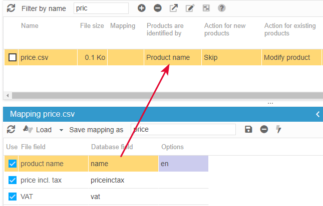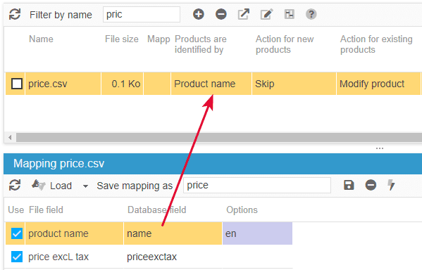Depending on the identifier you'll chose, here we use the product name, below is the example of a CSV configuration in the CSV import window: