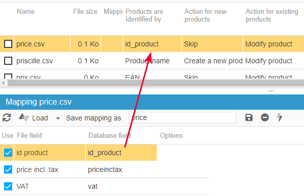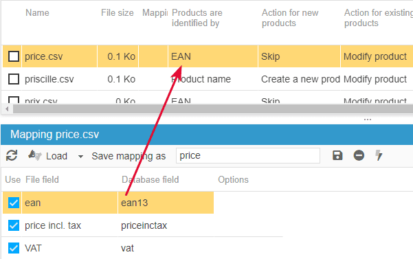 - the product identifier, meaning the product name or its ID or its reference or even its EAN13/UPC code. The important thing is that the identifier chosen is unique on each product (no duplicate)