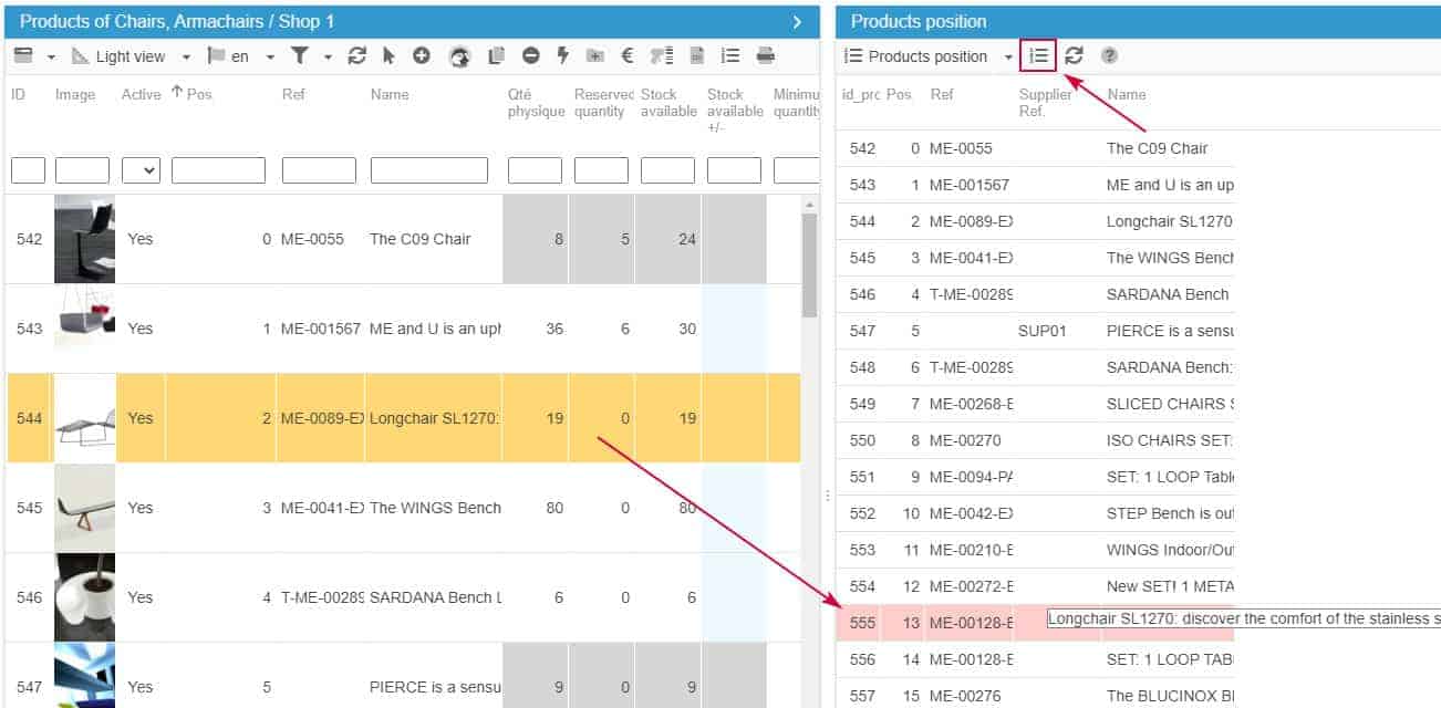Multiple views in the interface includes a 'Pos' (position) column showing the position number of each product in the selected category.
