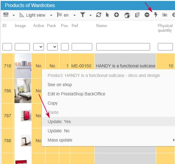 For all yes/no fields in the interface, such as active, on sale, show price, etc, you can use this option to update your products at lightning speed!