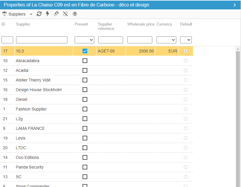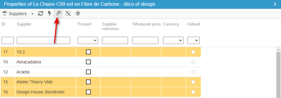 To associate or dissociate products > suppliers, you can either tick the corresponding boxes in the 'Present' column, or select the supplier lines and hit the