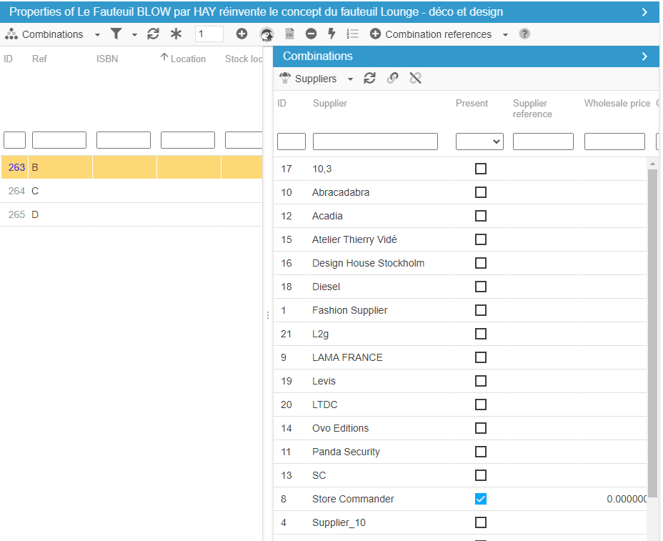 The Properties column includes a Suppliers panel where you can associate/dissociate products and suppliers, and also insert additional information such as the supplier reference, the wholesale price and even a currency.