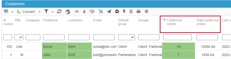 In the Convert view of the Customer interface of your Store Commander, you'll find two columns called 'Confirmed orders' and 'Total confirmed orders'.