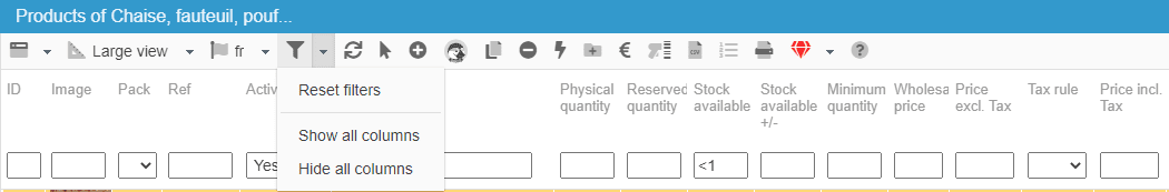 All filters are cumulative, so you can also apply a filter on a filtered list. Here we want to display products with no stock, quantity lower than 1: