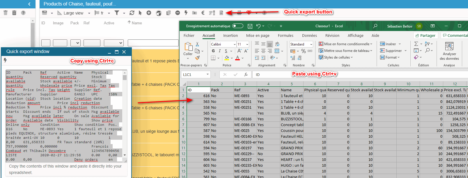 It can also be used to get the current product information on a spreadsheet in order to modify it, and then apply the modifications by importing the file (once saved as a CSV file).