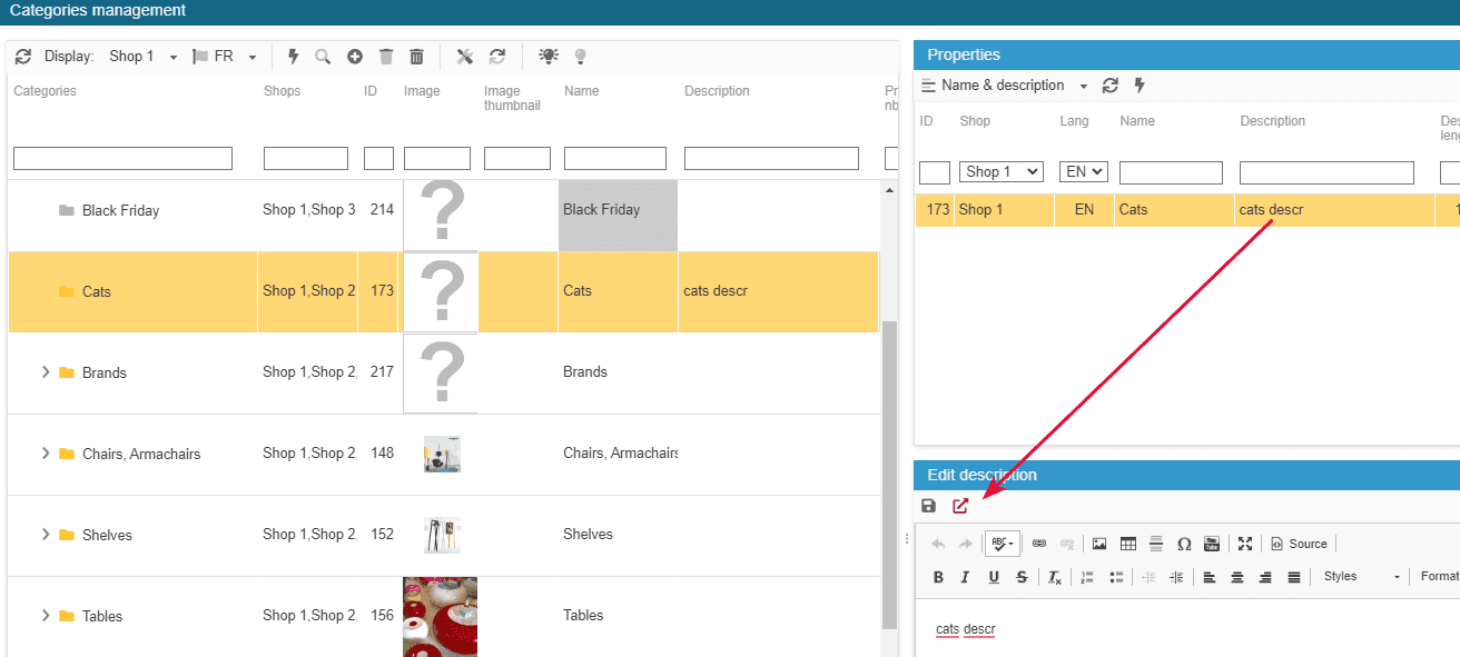 In the interface dedicated to categories (Catalog > Categories), you'll find the shortcut on the Description panel at the bottom right when a catégory is selected: