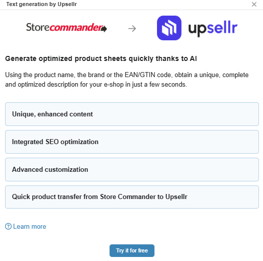 With the Upsellr functionality integrated into Store Commander, you can now optimise your product descriptions with the AI by Upsellr!