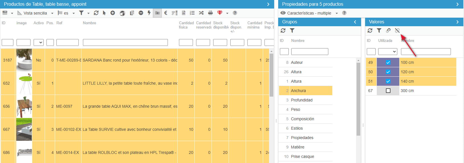 Por el contrario, si desea eliminar una característica de varios productos, utilice el icono de la barra de herramientas