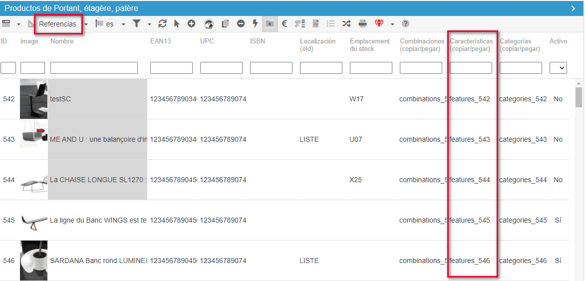 Esta opción se encuentra en la vista Referencias y se corresponde con la columna llamada "Características (copiar/pegar)"