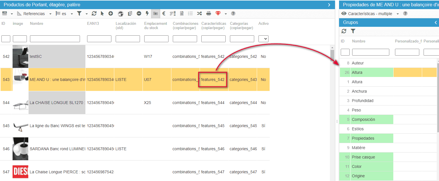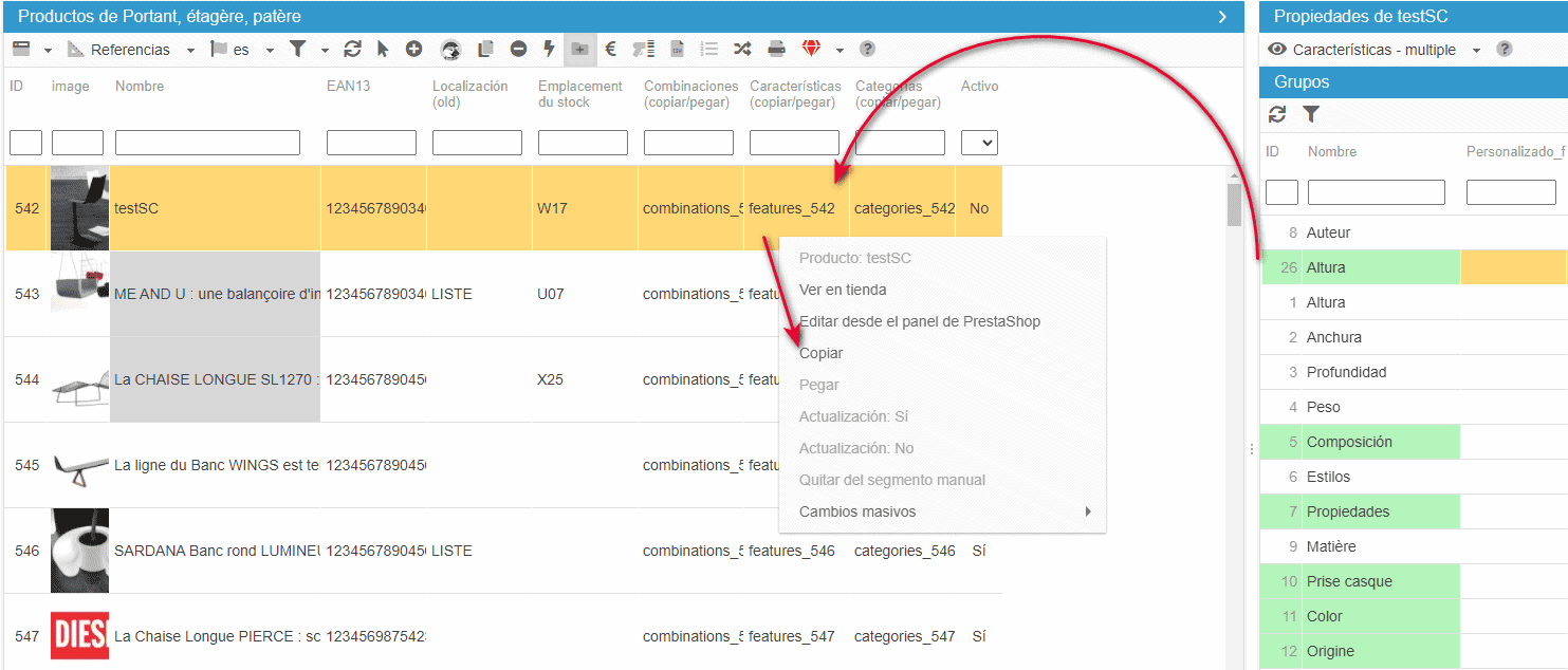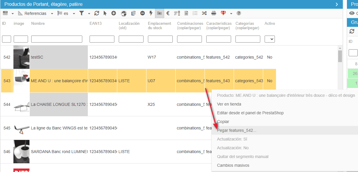 Para vincular estas categorías con otro producto, haga clic en el botón derecho en "features_xxx" > copiar, luego en el otro producto, siempre en la misma columna > pegar