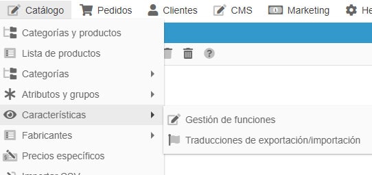 La interfaz de Store Commander incluye una ventana específica para la gestión de sus características, accesible en el menú Catálogo > Características.