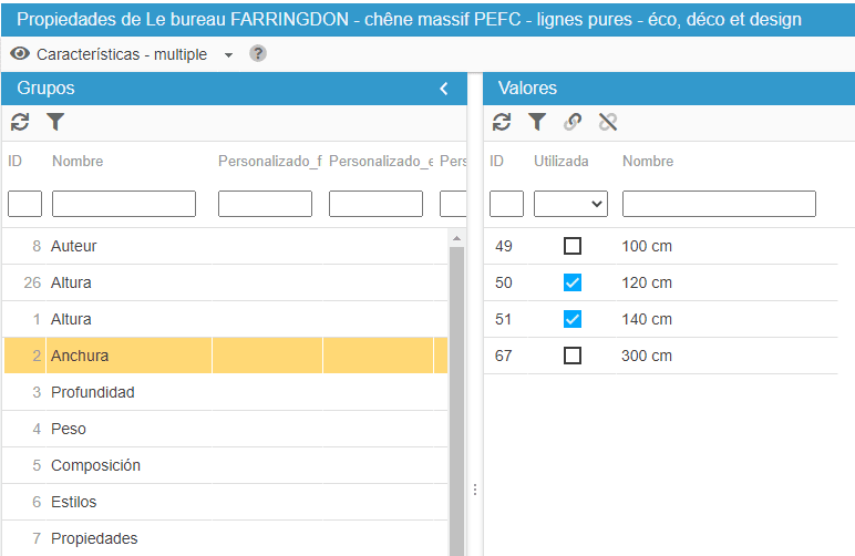 La cuadrícula está formada por dos paneles: los grupos y los valores (correspondientes al grupo seleccionado).