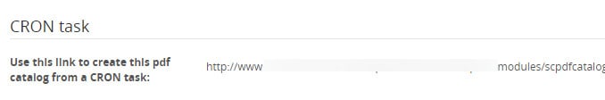 El módulo catálogo PDF creará un enlace específico para cada catálogo. Este enlace se muestra en la parte inferior del formulario de configuración. Deberá crear tantas tareas CRON como catálogos, espaciando estas creaciones en el tiempo para evitar una sobrecarga del servidor.
