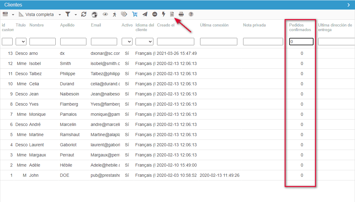La interfaz de Clientes de Store Commander le permite mostrar y extraer la lista de los clientes presentes en su base de datos, pero que aún no han pedido sus productos.