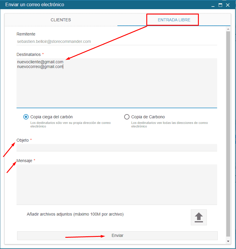 Para enviar un mensaje a una o varias personas que no forman parte de su base de clientes, utilice la pestaña "Entrada libre", para indicar los correos electrónicos de las personas en cuestión.